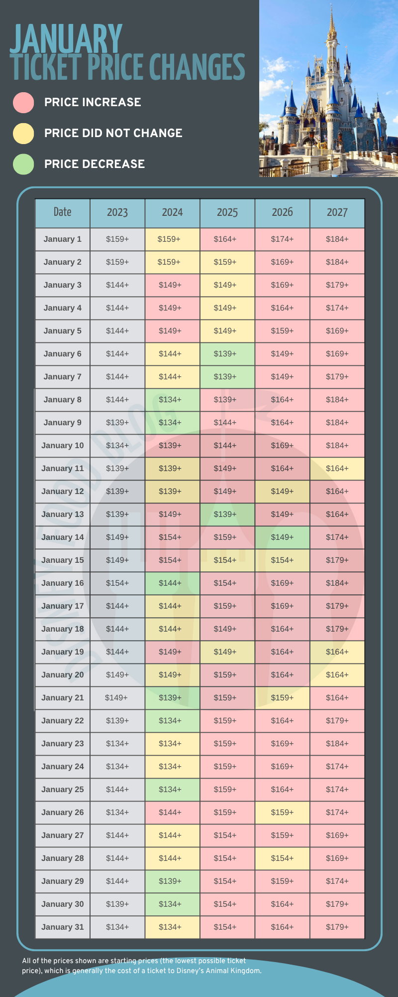 In January, almost every day of the month will see a price increase from the year before. However, three dates have the same price as they did in 2026: January 11th, January 19th, and January 20th. The price for these days remains the same as they were in 2026 at $164 per ticket.