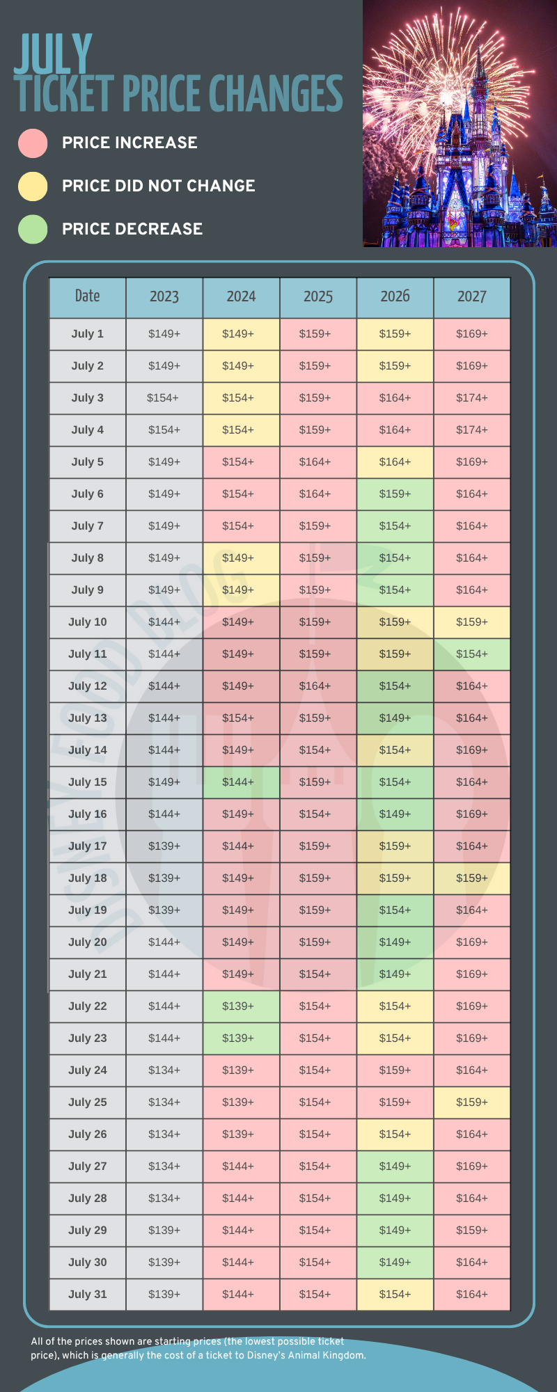 We saw a lot of ticket price increases in July, too, although one day will go down: July 11th. Only three days are the same in 2027 as in 2026: July 10th, July 18th, and July 25th. July also has no dates at the highest starting price or lowest starting price.