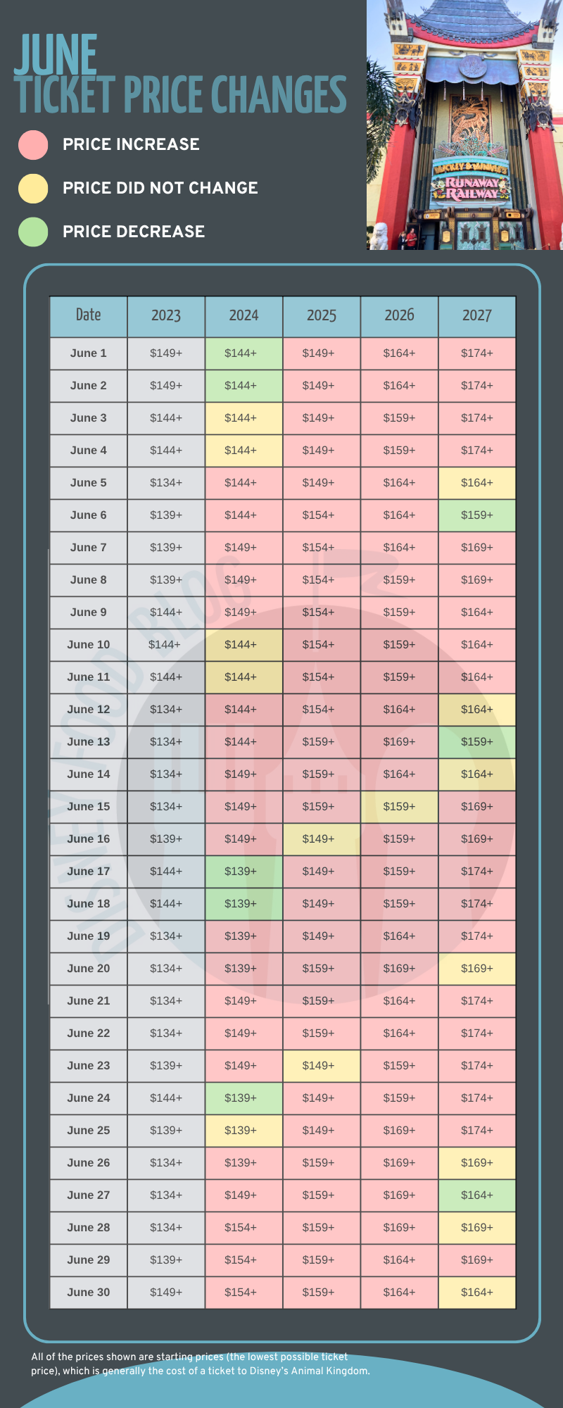 The least expensive dates in June 2027 to visit Disney World are: June 6th and 13th. Ticket prices for June range from $159 to $174.