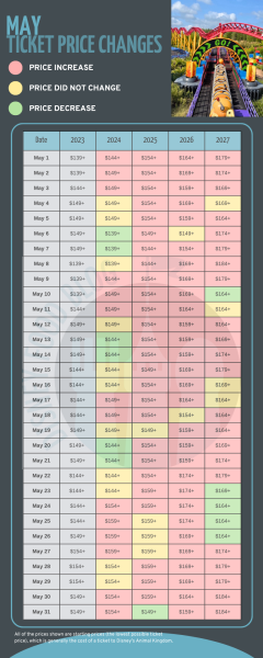 The least expensive dates for a Disney World trip in May 2027 are: May 10th, 11th, 12th, 17th, 18th, 19th, 24th, 25th, and 26th. Ticket prices for May range from $164 to $184.
