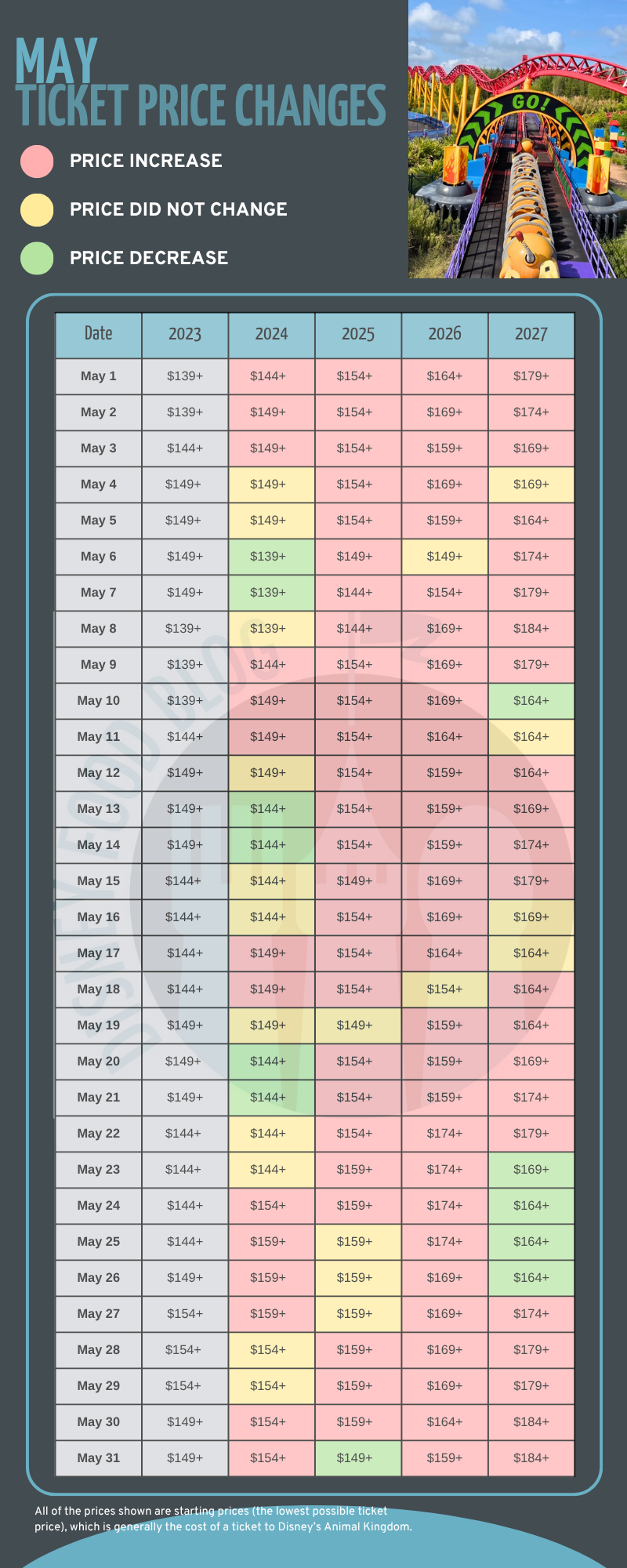 Many days in May 2027 will see a price increase, but five days will actually go down in price: May 10th, May 23rd, May 24th, May 25th, and May 26th. Meanwhile, four days will have prices the same as in 2026: May 4th, May 11th, May 16th, and May 17th.