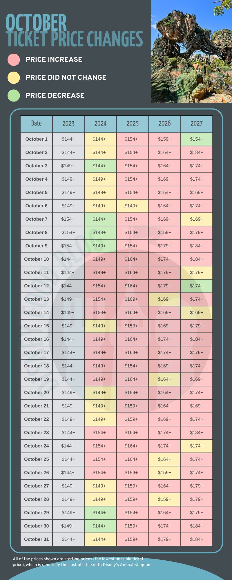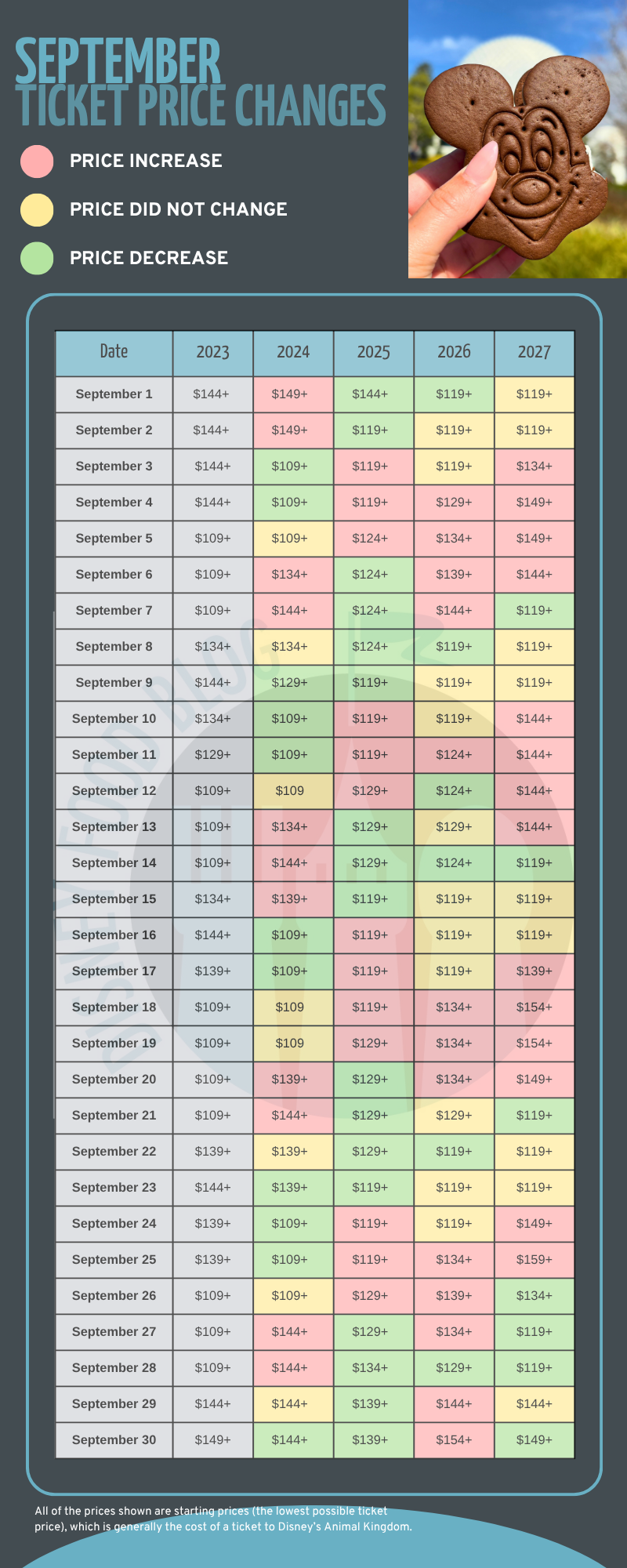 First, we want to start with a quick note: the prices we’re looking at are the starting ticket prices, which means they’re the lowest possible rate. As ticket prices not just vary by date, but also by park, these prices are generally for visiting Disney’s Animal Kingdom. You can expect other parks to be a bit higher. But these numbers can still help you decide the best days for you to visit Disney World.
