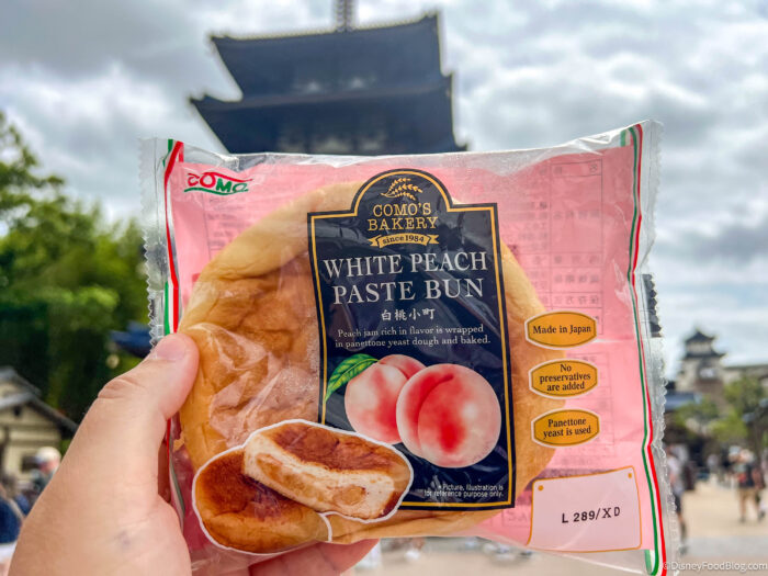 Starting out our list, we have the White Peach Paste Bun for $4.49. This looked kind of like an uncut hamburger bun when out of the package, and it was thinner than the other three treats we tried.