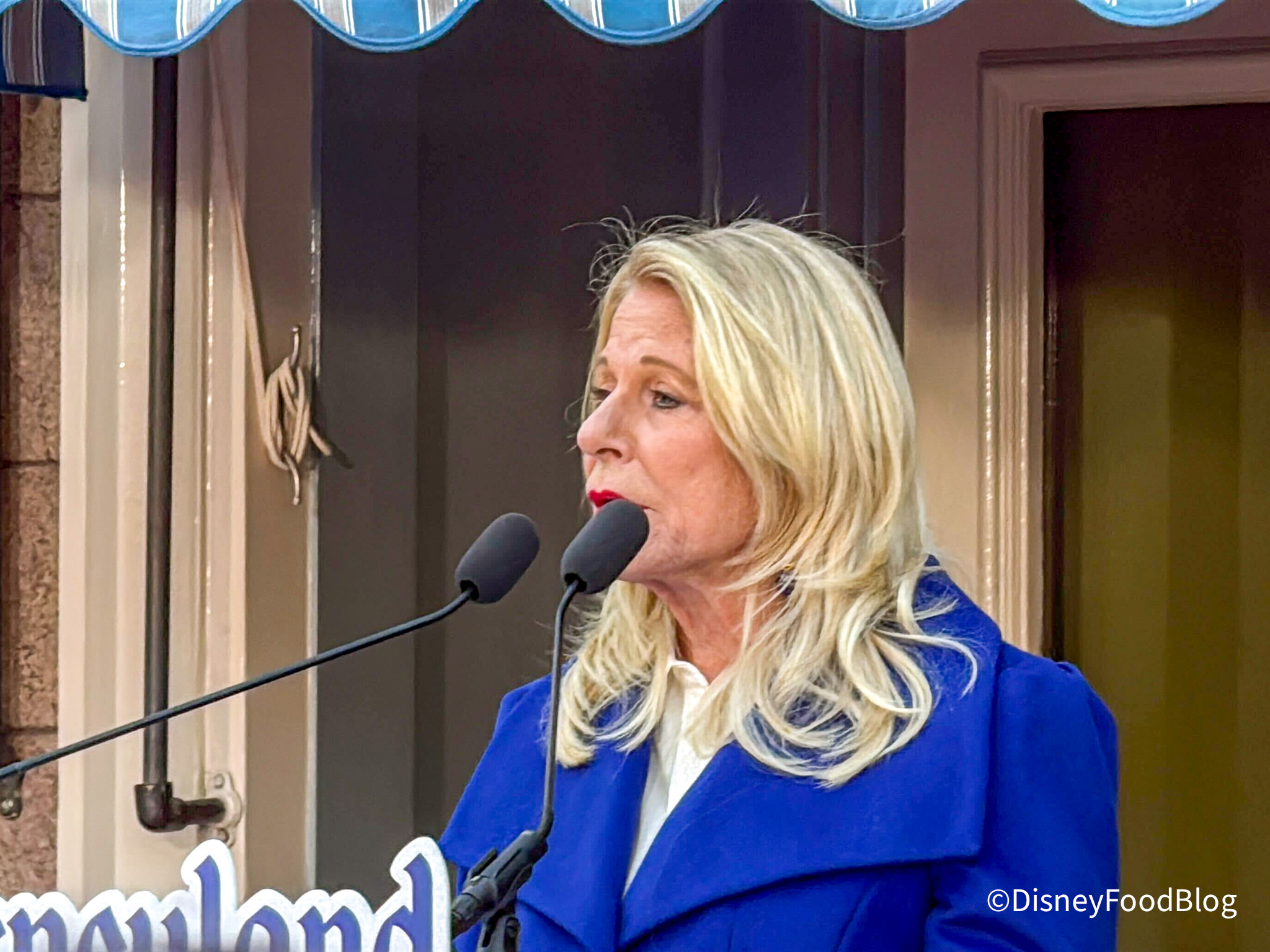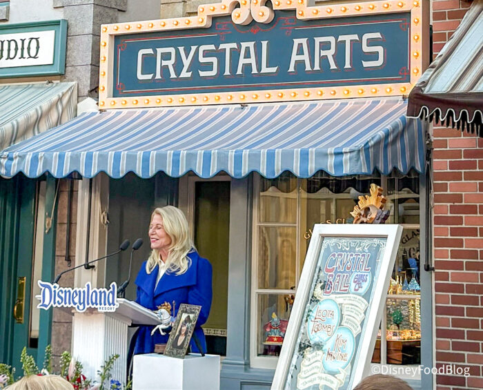 The unveiling happened early in the morning, before the park opened. Ms. Irvine’s window is located just above Crystal Arts on Main Street, U.S.A. Keep an eye out for it on your next trip to Disneyland! The ceremony kicked off with Disneyland Resort President Jill Estorino, welcoming us to the event.