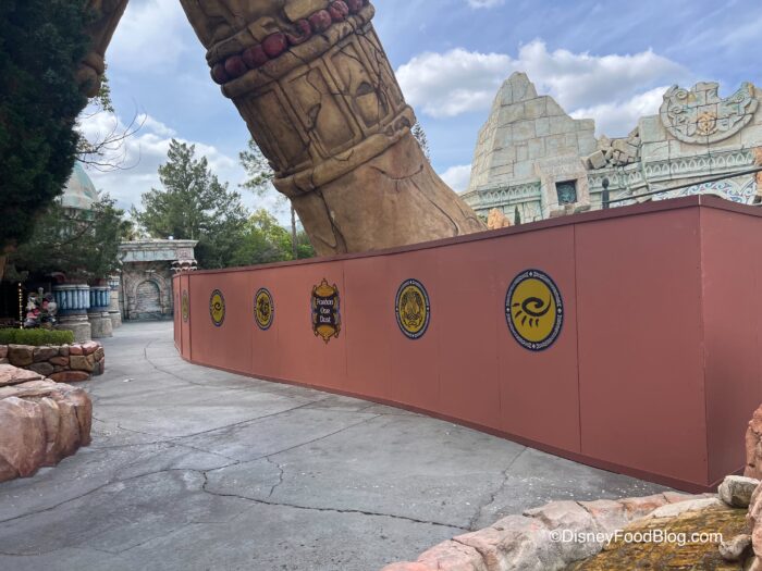 There are officially construction walls up around the outside of Poseidon’s Fury. It looks like Universal is going to start by taking down the exterior of the attraction.