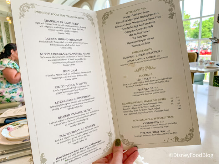 It feels SO special. The atmosphere makes the entire service feel lavish. Then you’ve got some amazing service. Cast Members are so knowledgeable about the teas and can really help you pick which ones to try out. After they bring out some rose-scented towels to wash your hands, they’ll also bring out the teas so you can smell them and then offer you their best recommendations on which ones you might enjoy.
