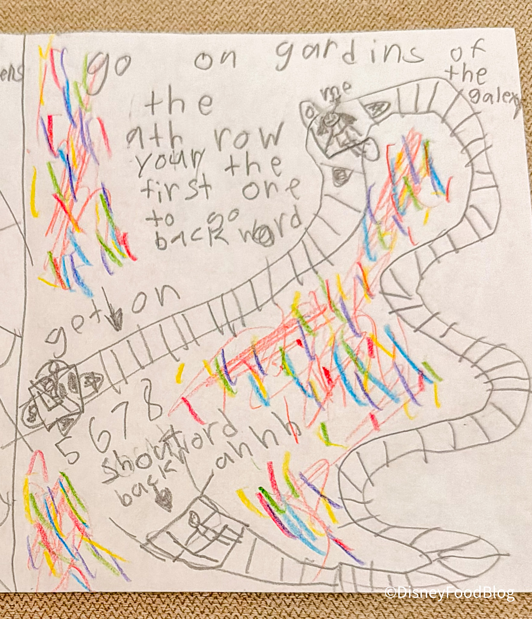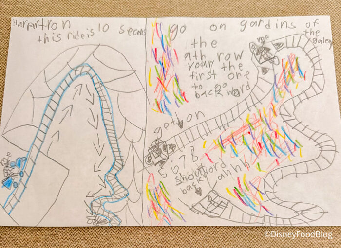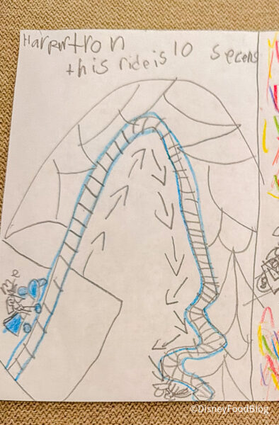 She also LOVES Cosmic Rewind — and again, I can’t blame her! It’s easily my favorite Disney World roller coaster, so it must run in the family. The color in this panel of the drawing evokes both the flashing lights and scenes of this ride, along with the vibes of the music. She’s even giving some of the best advice for this ride in her drawing — if you request Row 9, you’ll end up being in the front row when the ride eventually launches you backward.