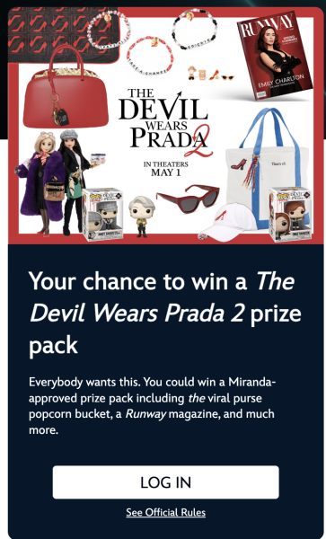 The prize packs could include the Purse Popcorn Bucket (yes, it’s the viral popcorn bucket), a real Runway magazine, Funko Pop! figures inspired by the main characters, bracelets from Little Words Project, and more merchandise designed for the film. We want that popcorn bucket to a degree that is unhealthy.