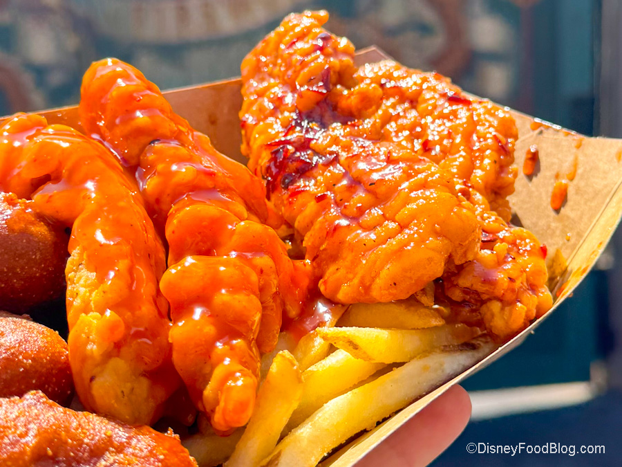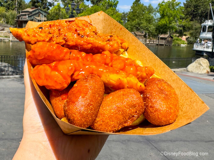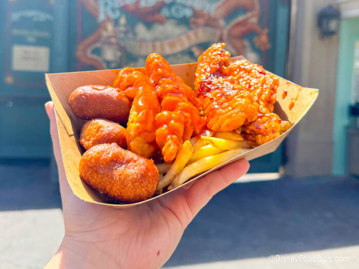 There’s just one thing we have to tell you: this food sampler box is only available to Magic Key Holders at Stage Door Cafe. It’s the Magic Key Samper Box, and it comes with two servings of tenders MASSIVELY smothered in your choice of sauce (and sauce choices are hot honey and mango habanero — we got both!) and fries for $17.99. First, this is a MASSIVE amount of food, which means it’s shareable. That means this could be the best value meal you’ll find in the park.