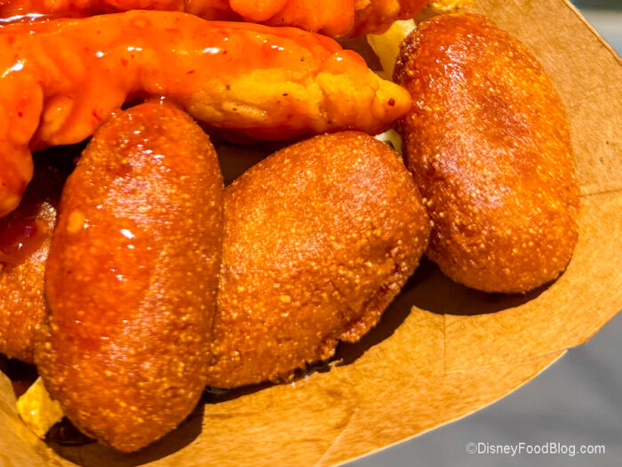 Our biggest complaint is that the sauce leaks onto the fries and makes them soggy, but that’s a minor issue. But let’s talk about taste. The mini corn dogs are perfectly juicy and salty, all in a bite-sized form. Honestly, we could eat hundreds of these in one sitting. The fries are regular Disney fries, which we, honestly, love.