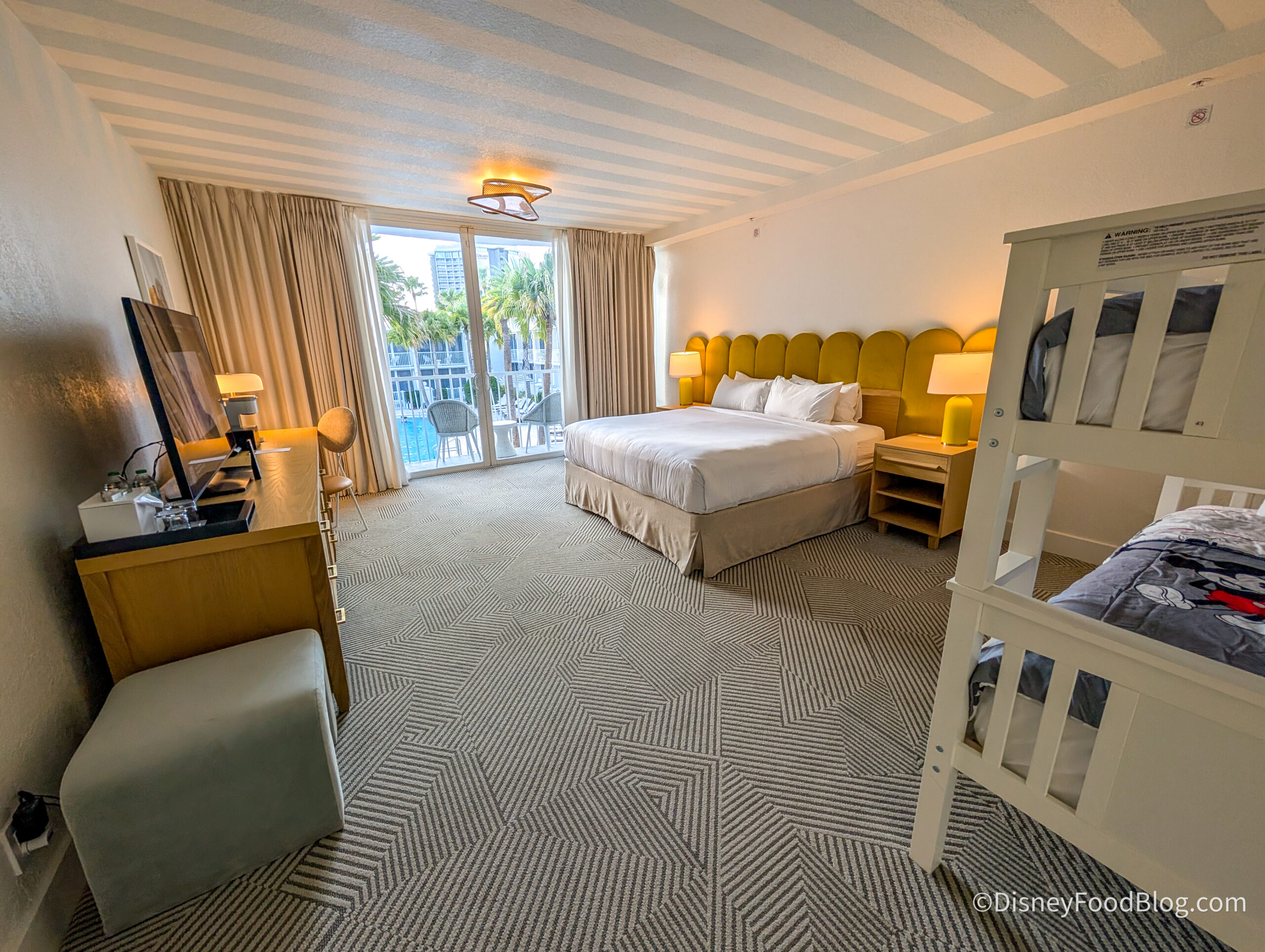 If you want a room closer to the pool with a view, we recommend checking out the Lanai Rooms, which start around $150 per night (when looking at dates in August 2026). However, we got to see one of their Lanai King Deluxe Bunkbed Rooms, which start at around $180 per night (also in August 2026) and can fit four people.