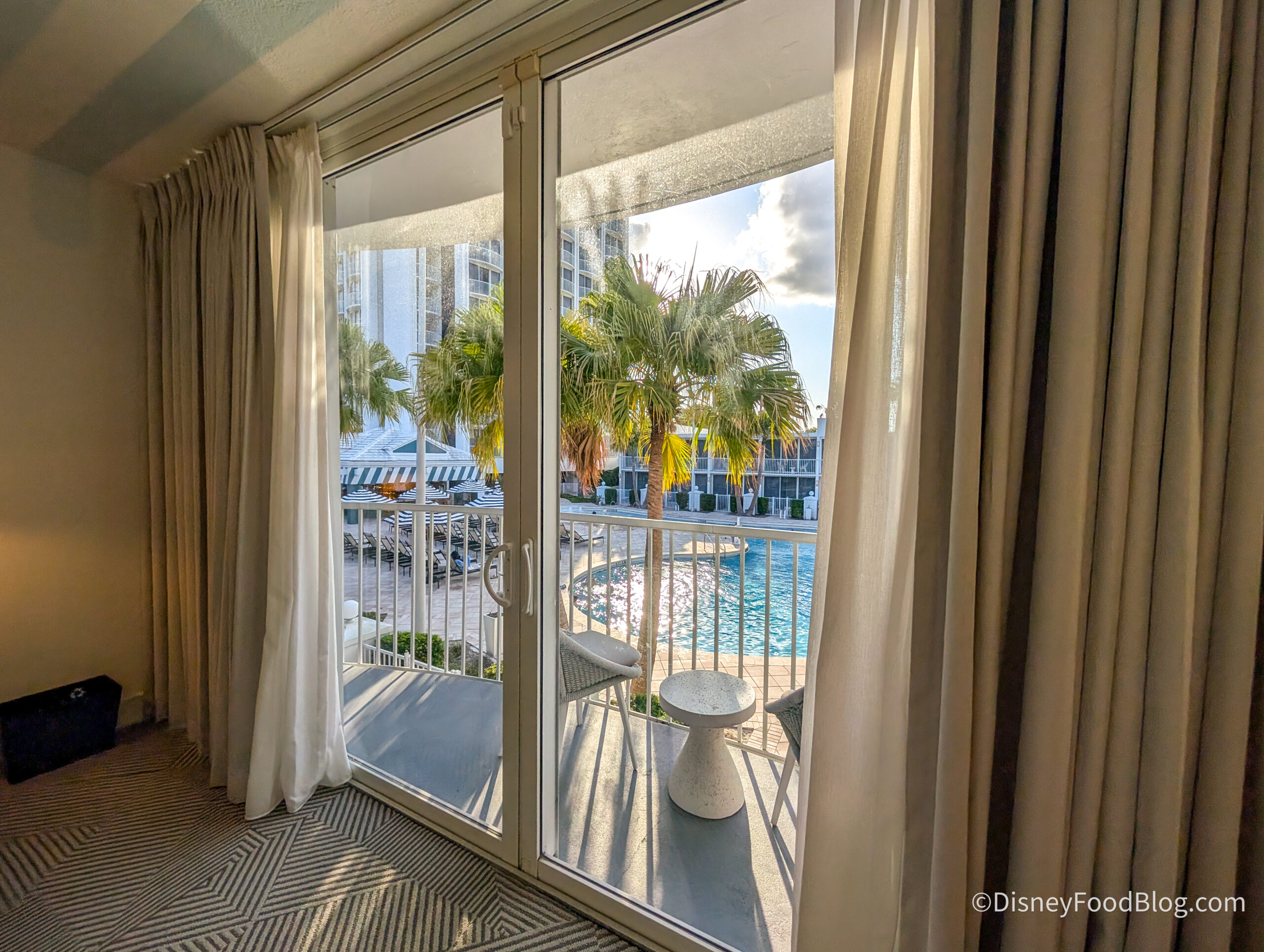 Then, we come to one of the biggest draws of the room — the balcony that looks out over the pool! While this won’t be the best for people who want some peace and quiet, as the pool is often busy, it’s a great way for parents to keep a close eye on their kids without necessarily sitting right at the pool deck.