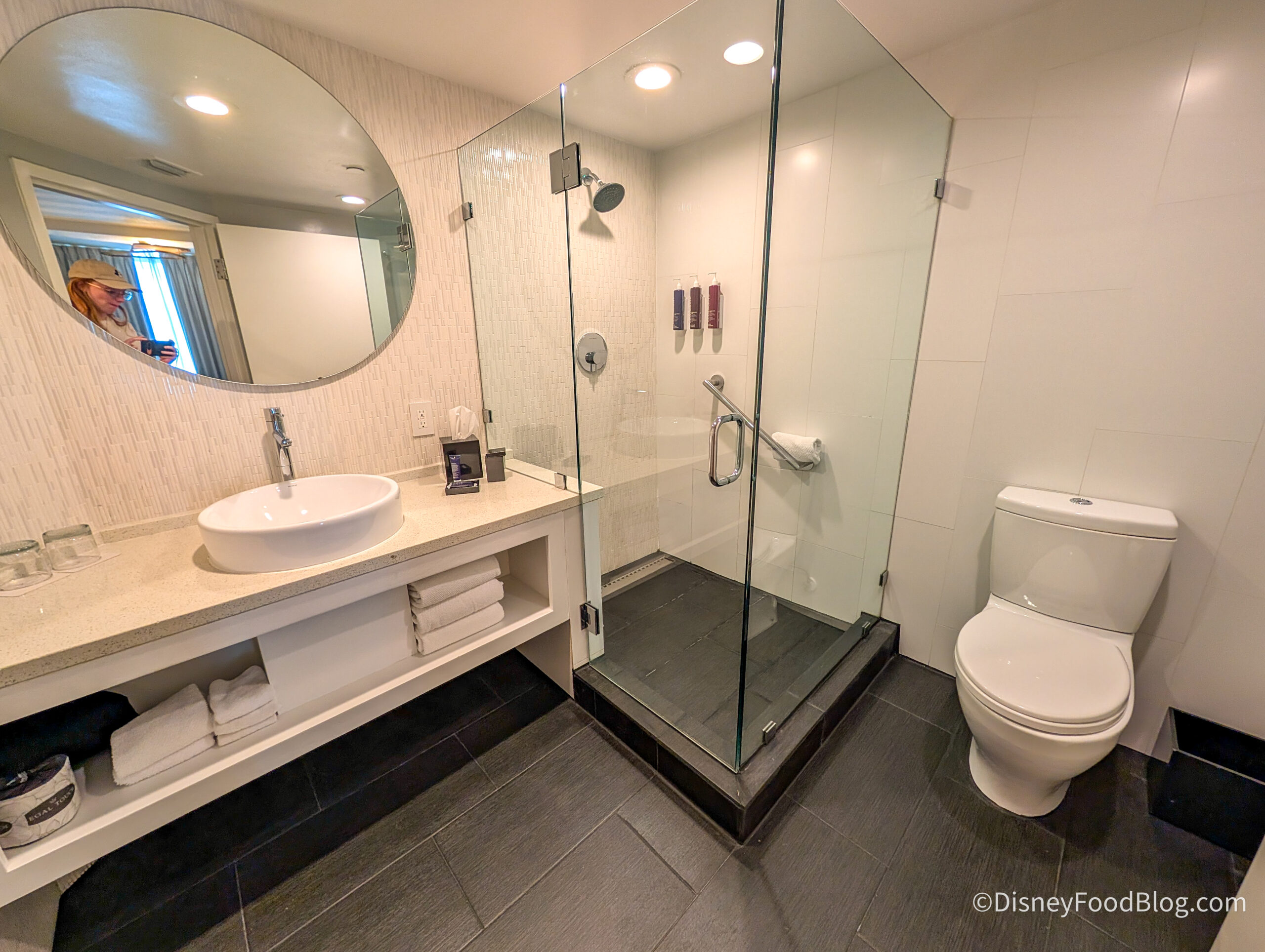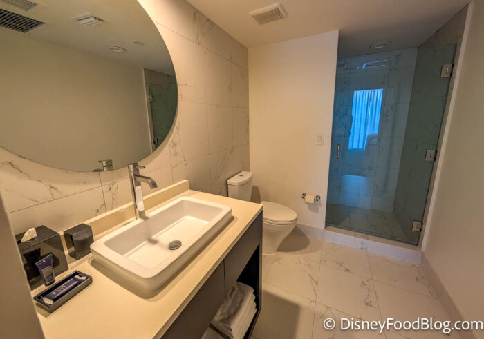 When you enter the room, the bathroom will likely be right off to one side (in our case, it was to our left). In here, there isn’t a bathtub, but a glass shower, along with a sink and commode all in one room. However, there are plenty of towels and additional space on the countertop, as well as under the counter.