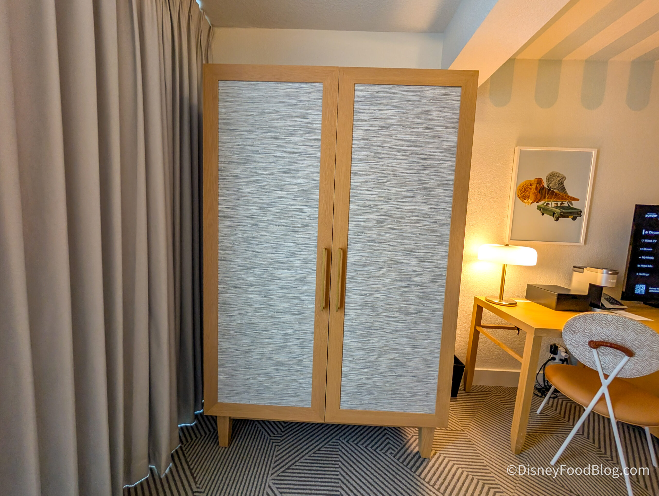 Opposite the bed, you’ll find a TV on a dresser that allows for more storage, as well as a desk and desk chair. To the left of that, you’ll find a full-length mirror closer to the bathroom.