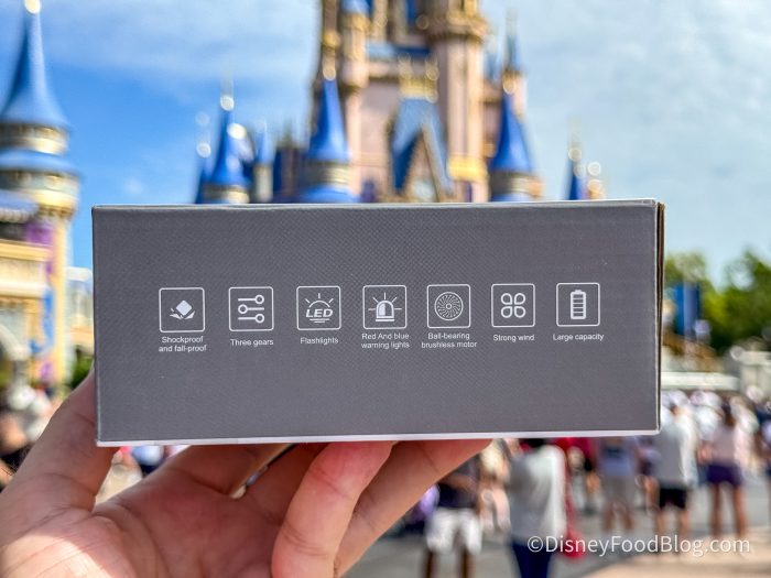 Not to mention it’s also shockproof and fall-proof, it has a flashlight, has red and blue warning lights, and has a really large battery capacity. It’s definitely the fan we recommend for the heat of summer, and it’s worth the extra space it takes up in your bag!