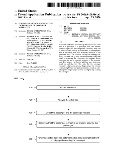 Disney’s new patent, published on April 23, 2026, is US Patent Application US 2026/0109316 A1, which details a new AI system that could help verify passengers’ restraints are properly in place. Described as “System and Method for Verifying Proper Usage of Passenger Restraints” in the patent, the AI would use video cameras combined with machine learning models to analyze whether a passenger restraint system is properly in place. This would account for lap restraints, over-the-shoulder restraints, or seat belt.