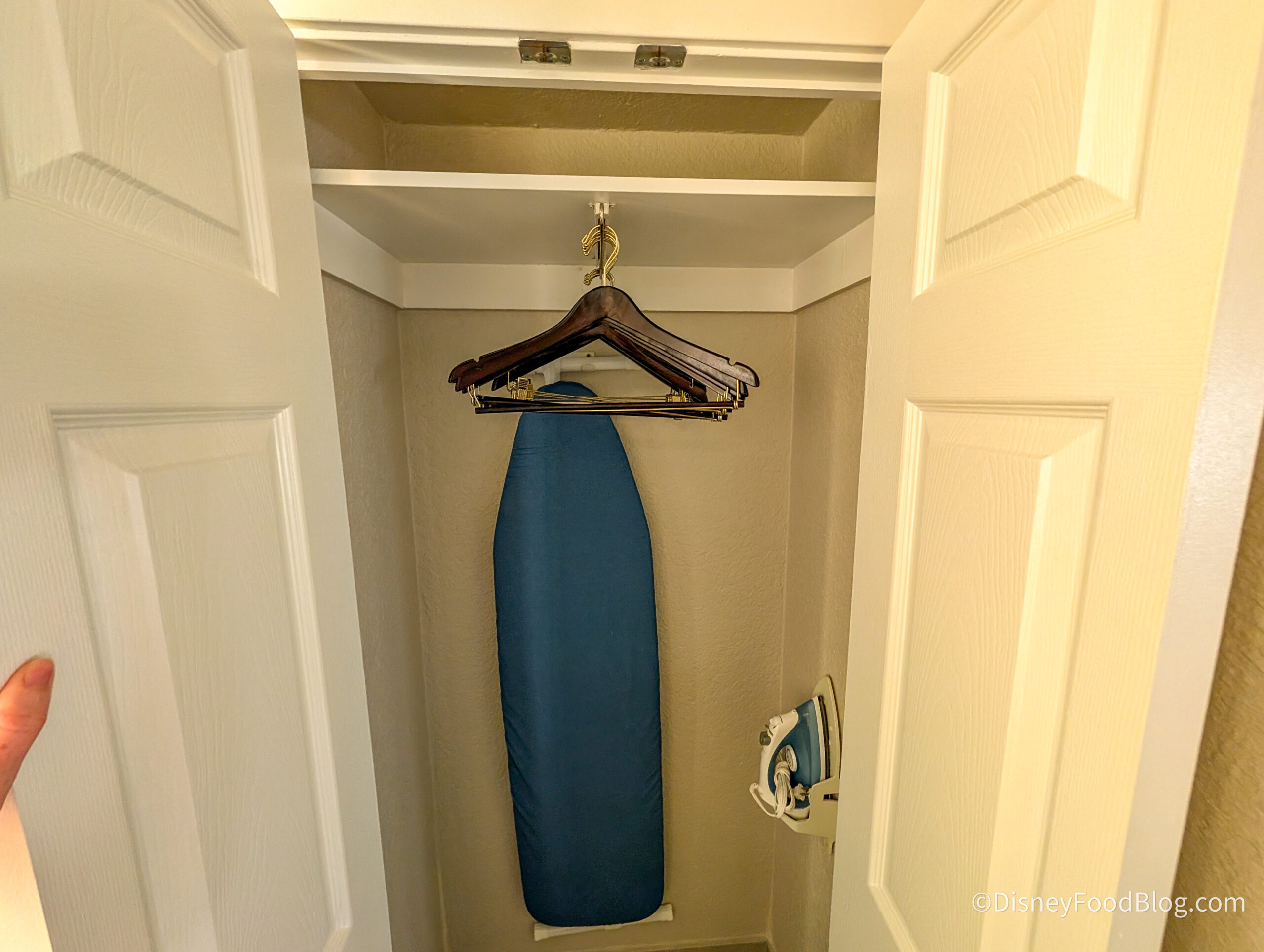 In the closet on the right is where you’ll find the iron, ironing board, and hangers. Off to the left side of the bathroom is the commode room, which is also where you’ll find the shower.