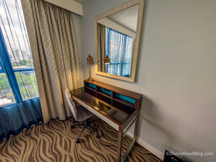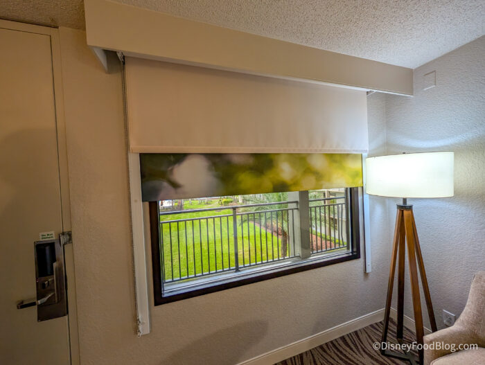 We got to check out a Wyndham Garden Courtyard View Two Doubles Room, which gives you a look out into the courtyard below when you step out into the outdoor hallway. You can even spot a hidden Mickey in the grass! These rooms usually cost around $239 a night.