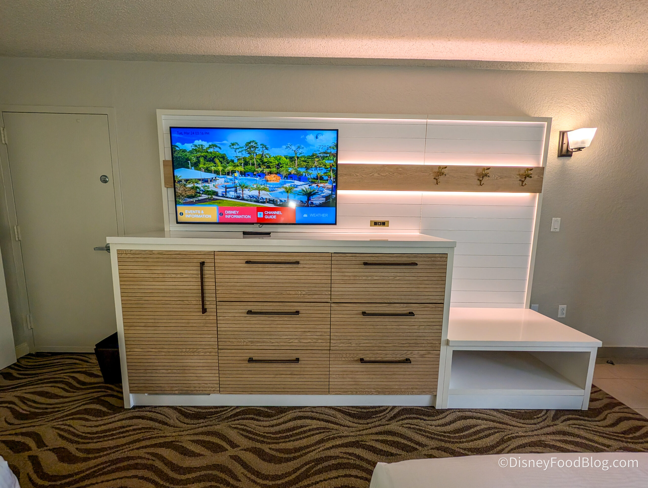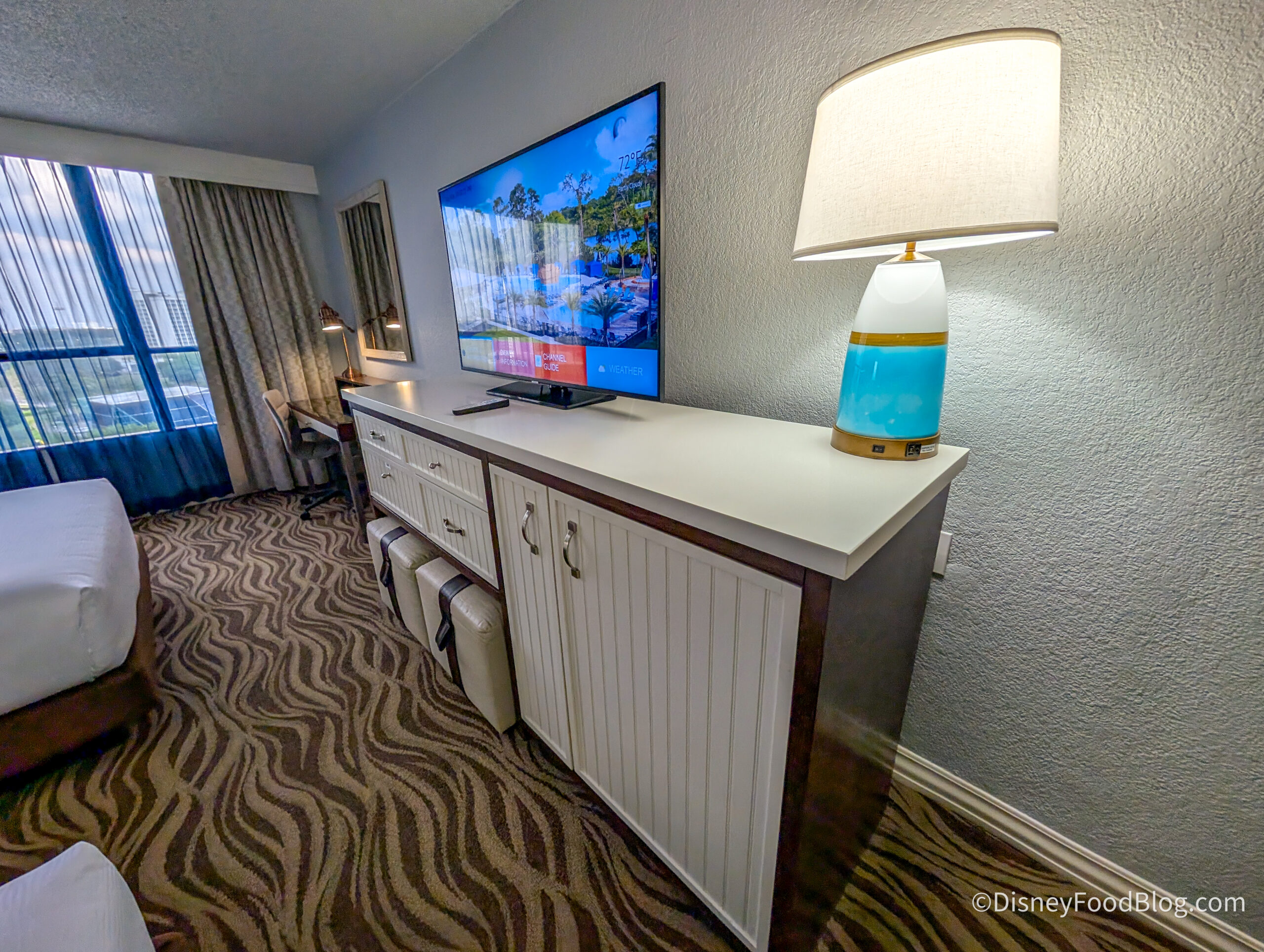 Across from the beds, just like in the other rooms, is the large dresser with the TV. On one side, you’ll find a lamp on top with one drawer hiding the mini fridge, while the other, long, rectangular one has the coffee station. We also love the small square seats under the smaller drawers, to allow more space for seating, as needed.