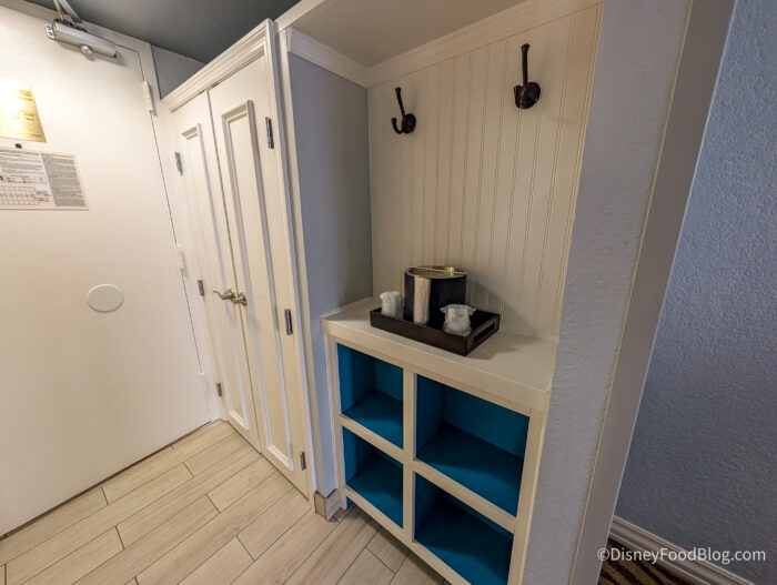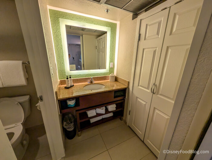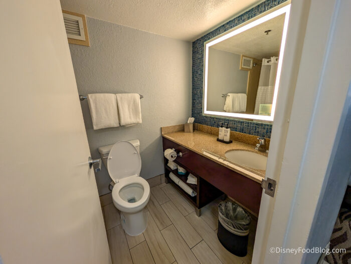 This room is a bit more spacious than the ones over at Wyndham Garden, so if you need a bit more space, this is the way to go. Immediately to the left when we walked in was the closet, as well as the icebox. There are also additional cubbies for storage (great for everyone’s shoes!), and two hooks. The bathroom is immediately to your right when you walk in and includes a bit more counter space. However, the sink, shower, and commode are all in one room, so that’s something to keep in mind.