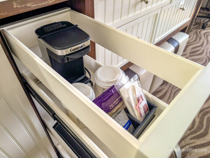 Inside the cabinets of the dresser, you’ll find the coffee station, the mini fridge, and plenty of empty drawers for your stuff.