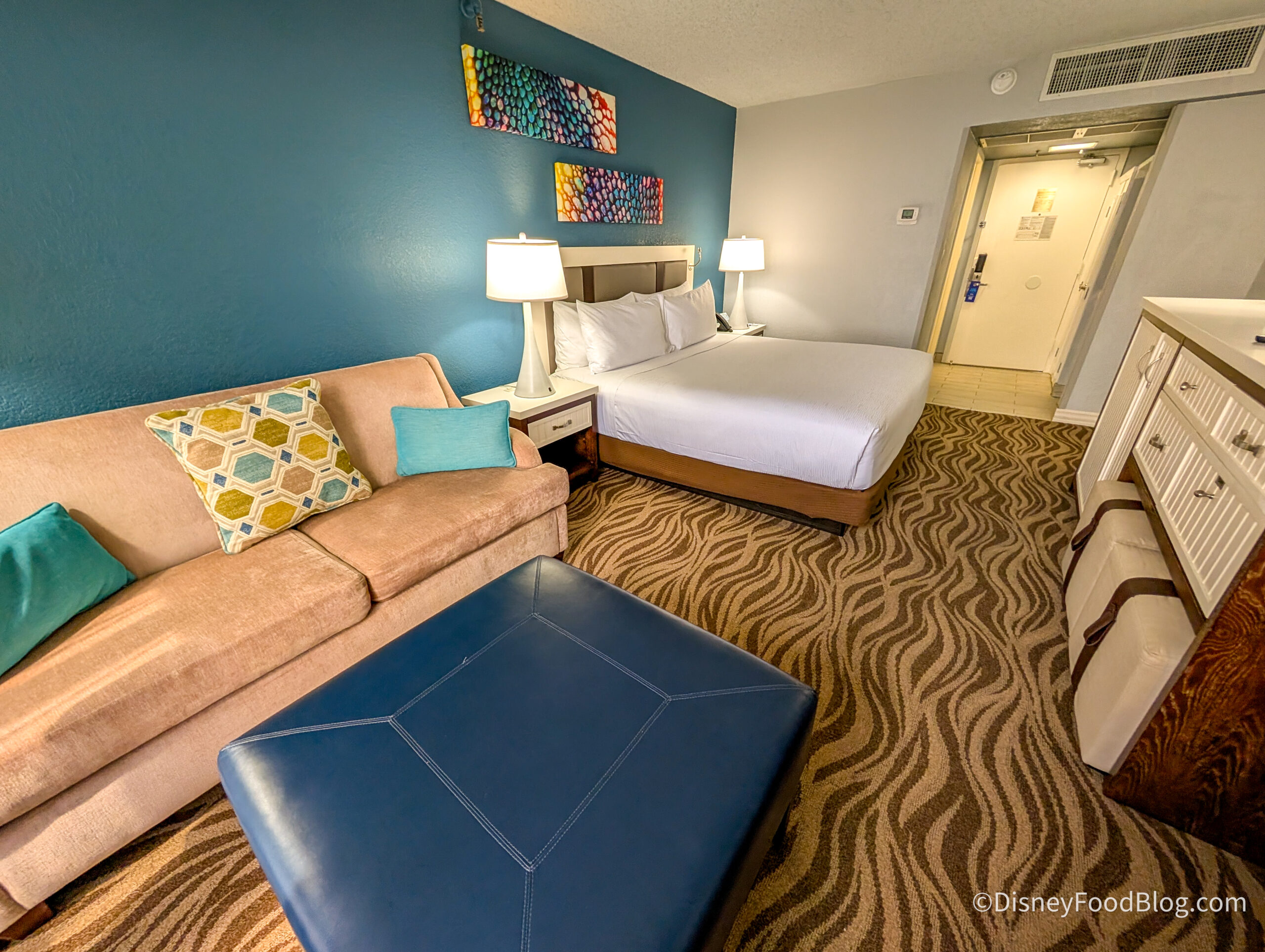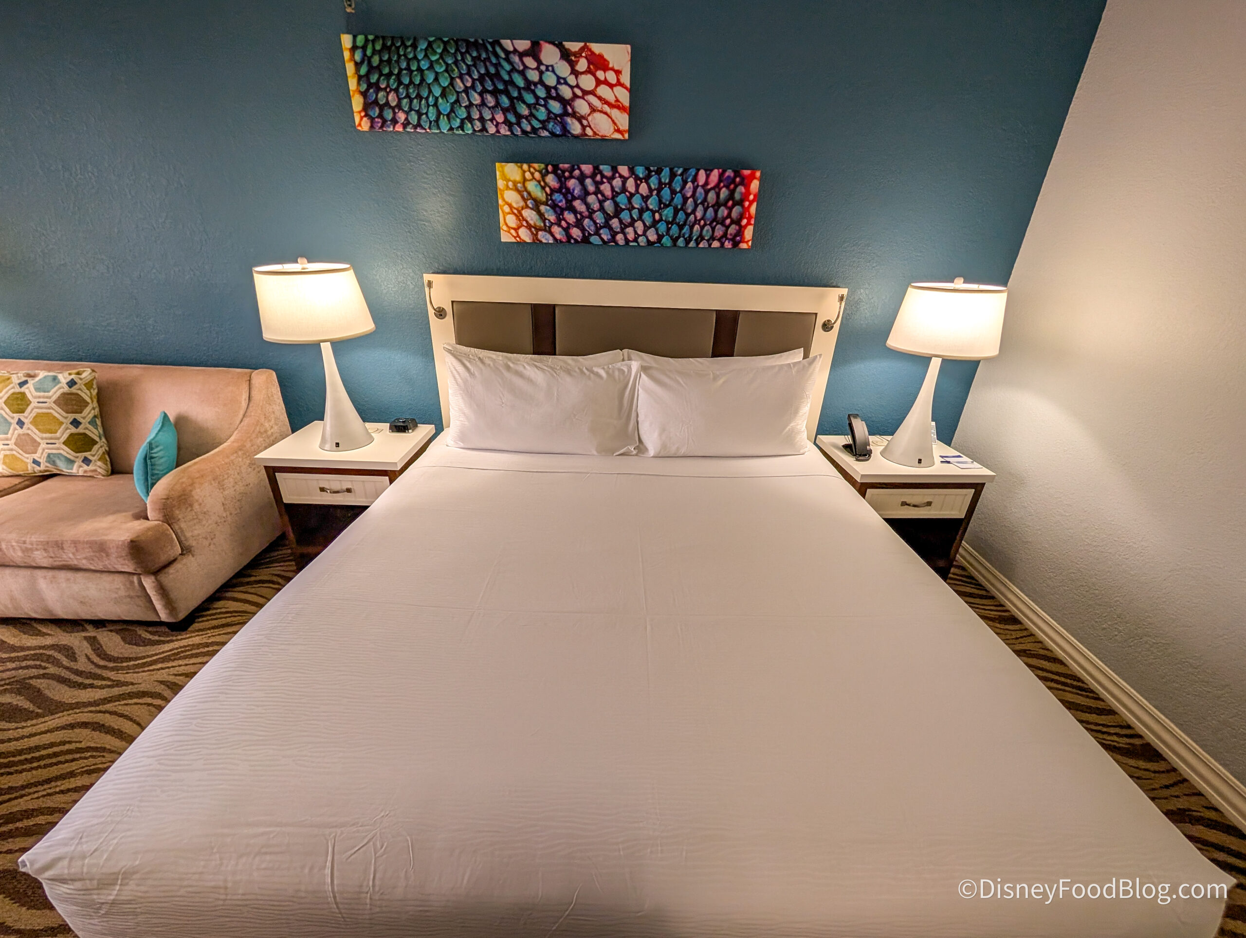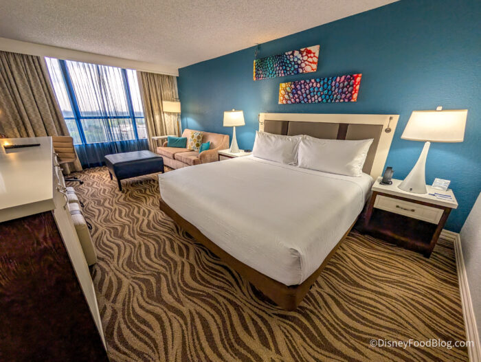 If you’re looking for something a little more elevated, you may want to check out the rooms inside the Wyndham Lake Buena Vista hotel, which is attached. These rooms usually start around $394 a night, but the entrances to all rooms are located in indoor hallways. The first room we checked out here was the Wyndham Lake Buena Vista Disney View King.