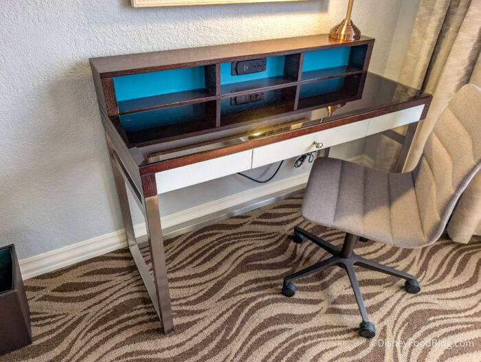 On the opposite side of the room, you’ll find a desk with plenty of outlets, along with a comfortable desk chair to sit in…