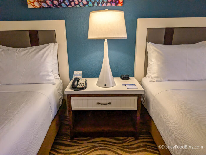 You’ll find a nightstand in between the two beds, complete once again with outlets, a lamp, an alarm clock, a drawer for storage, and the hotel phone.