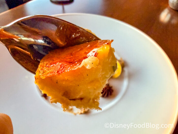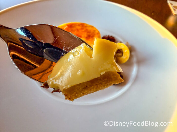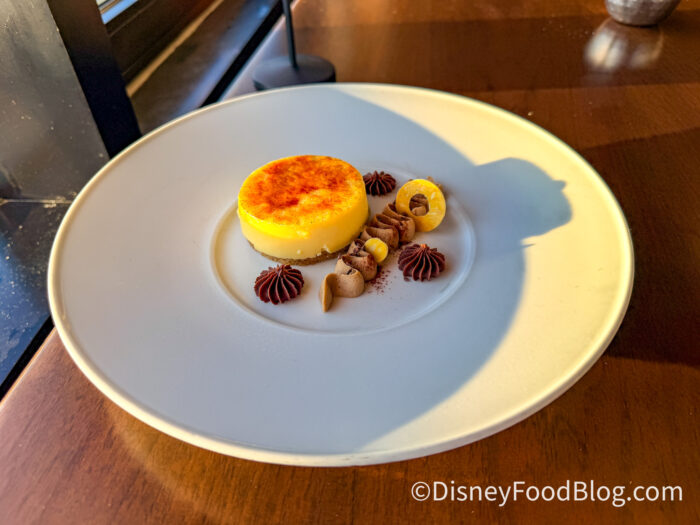 The crème brûlée panna cotta was so creamy, and the top had a very satisfying shatter. There’s a coffee swirl cream across the plate, which is absolutely delicious with the dark chocolate dollops. The ladyfingers are the base under the crème brûlée panna cotta. This was a light and airy yet creamy dessert. It’s a really creative spin on two classic desserts, making them both seem like a modern, cohesive dessert.