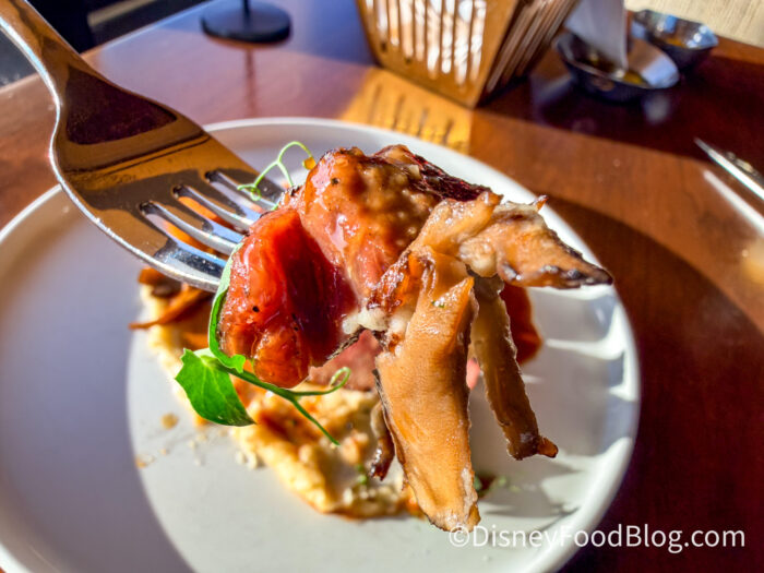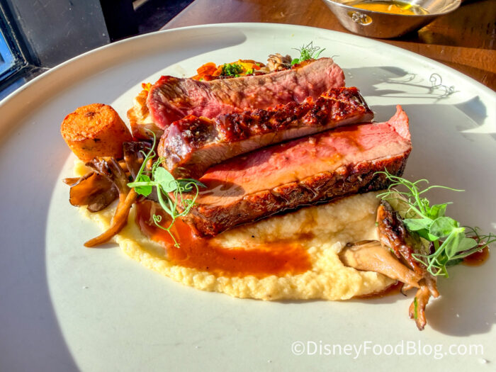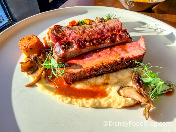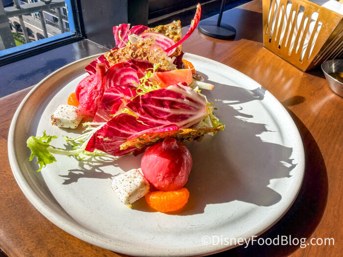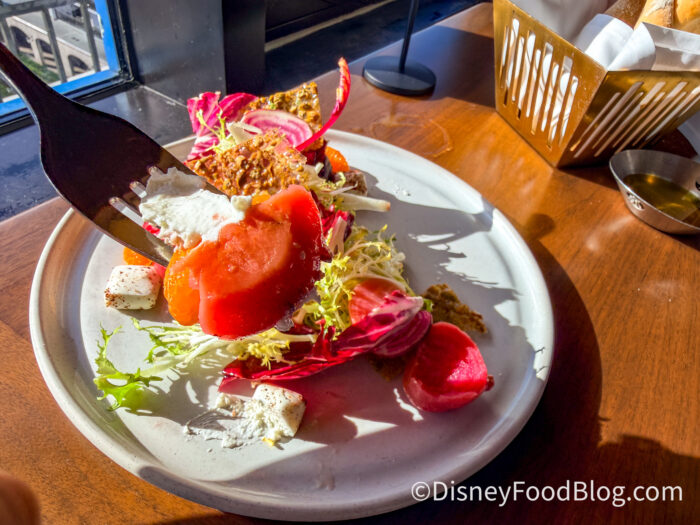 The salad felt like a choose-your-own-adventure with each bite. The goat cheese had fresh cracked pepper, and then there was the frisé with the radicchio with the beats, and of course, the pistachio brittle. Literally no two bites were the same, and that’s what makes this dish so much fun and one of the best salads we’ve EVER had on property.