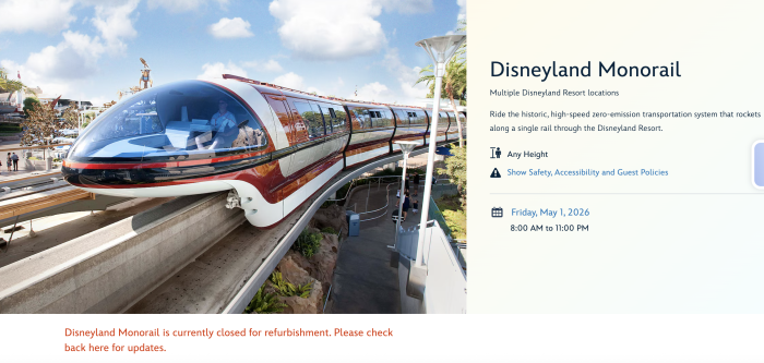 The Disneyland Monorail officially reopens on May 1st, according to the Disneyland calendar! While the Monorail page itself doesn’t have it listed, when we went forward on the calendar, we could see times listed again beginning on May 1st.