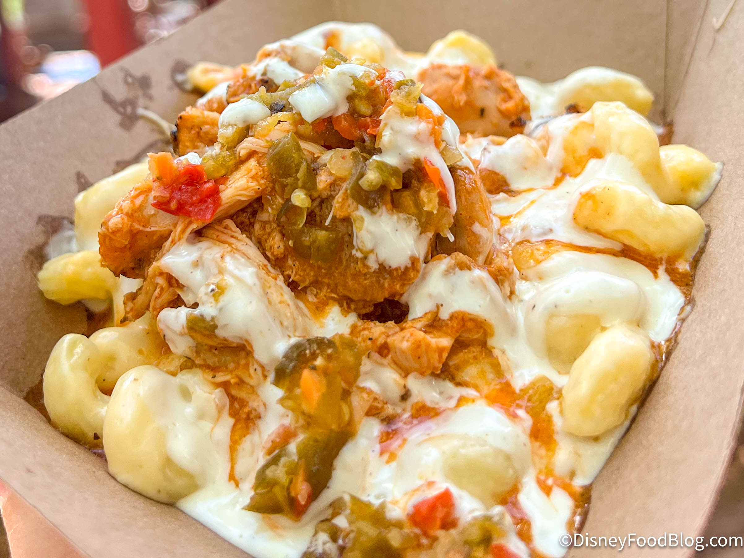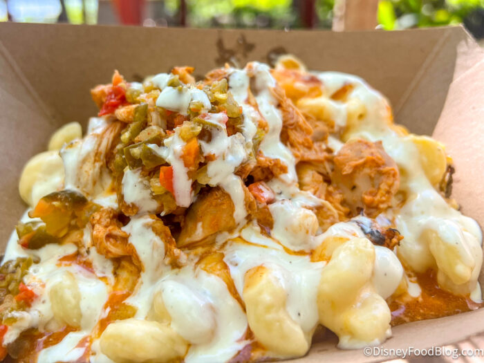 If you want to grab this Baked Macaroni & Cheese with Buffalo Chicken, it’s available at Eight Spoons Café on Discovery Island in Animal Kingdom. We love their Baked Macaroni & Cheese with Pulled Pork, Buffalo Chicken Chips, and Family Churros. If you’d want to grab a drink with your mac and cheese, we love The Simba Drink! It’s a mango-flavored slushy with grenadine and gummy worms.