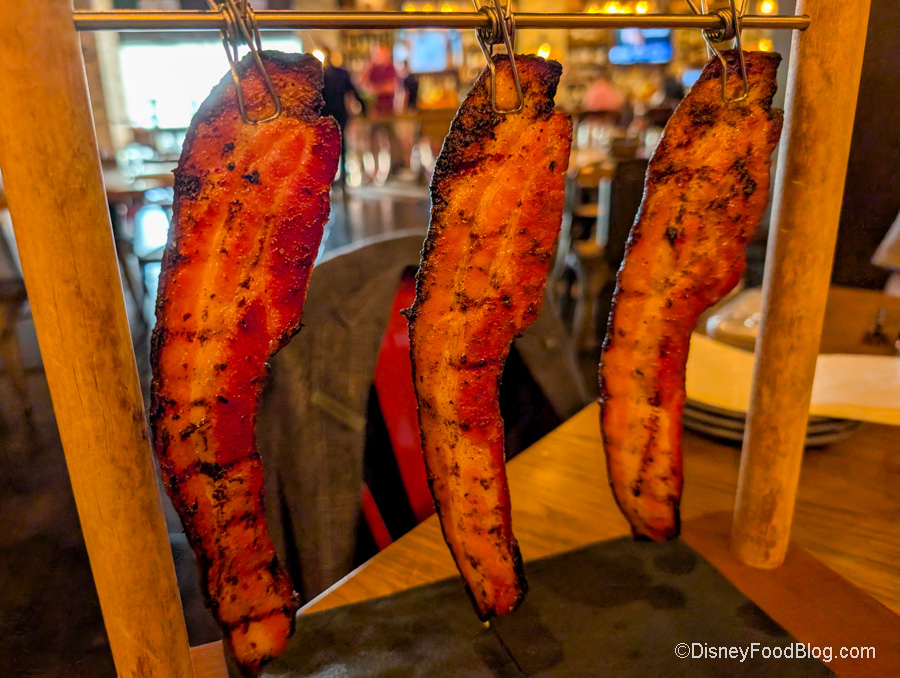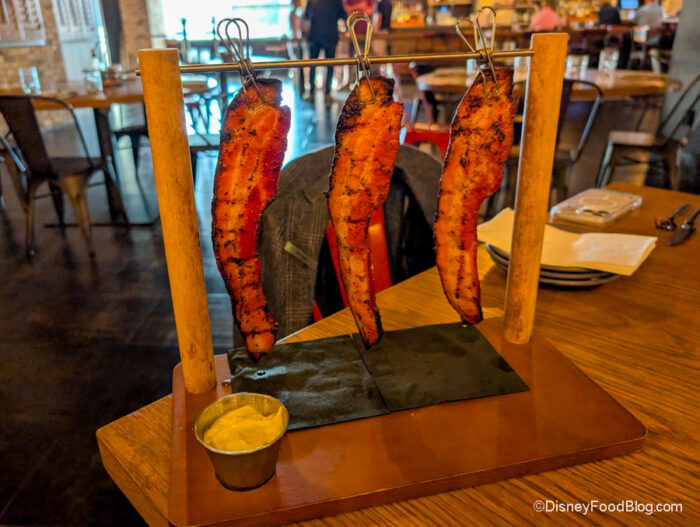 Okay, so for our starter, we couldn’t resist the AK Smoked Bacon “Clothesline” for $17. You get Smoked Pastrami-Spiced Nueske’s Bacon, Hung and Torched, and served with Horseradish Mustard Aioli. Yes, PLEASE! This is an appetizer we’d call a crowd-pleaser. First, the bacon is that good quality meat. Then you have the fun presentation. It’s also just cooked perfectly. The spices come through so well, too, so it’s a flavorful piece of meat.