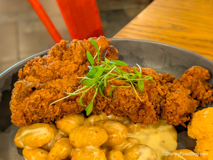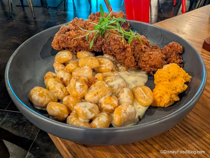For our main, we ordered the Crispy Chicken Gnocchi Mac and Cheese for $22. It’s Crispy Chicken, Gnocchi, Smoked Gouda Sauce, and Sun-Dried Tomato Parmesan Foam. Y’all…where has this been all our lives? We were told this was a popular menu item, and we know why! First, it’s HUGE, so it’s shareable.