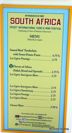 South Africa is back this year with the big winner from last year — the seared beef tenderloin with sweet potato puree and mango barbecue sauce! They’re also introducing Flavors of Africa in 2010, a salad, bread, and spreads food offering.