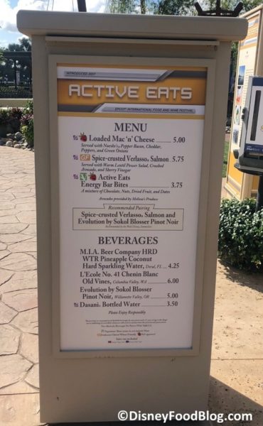 Active Eats was a new booth celebrating the 35th anniversary of Epcot in 2017. The booth brought back a few favorites from previous Epcot Food and Wine Festivals — Loaded Mac and Cheese with bacon (!!) and green onions, and Roasted Verlasso Salmon!