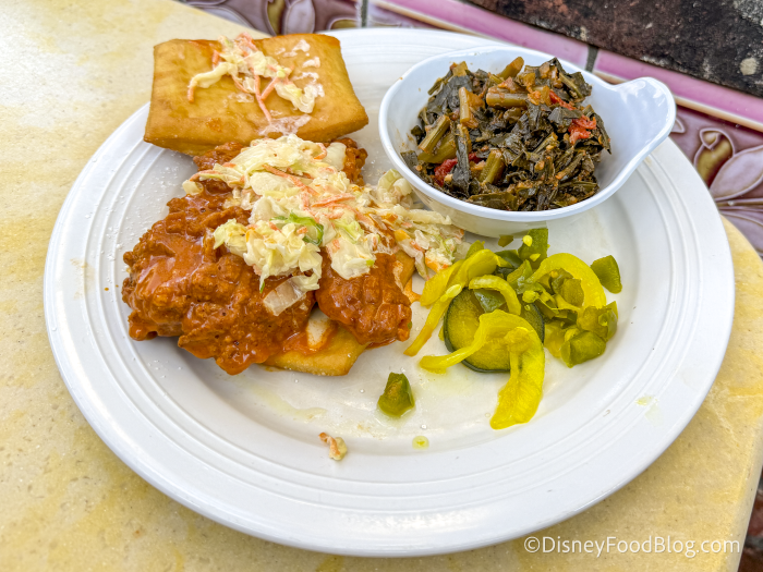 - Sweet Heat Beignet Chicken Sandwich: Fried chicken, Buffalo sauce, and creamy slaw on fresh beignets served with collard greens and house-made pickles (New)