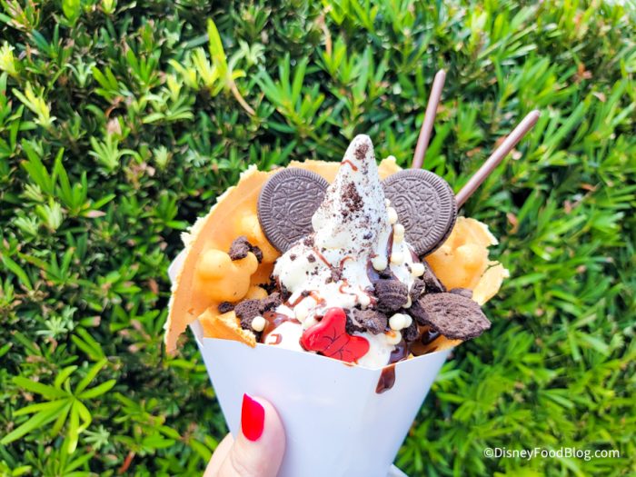 We’ve recently tried a Pepperoni Pizza Egg Roll in EPCOT, a Berries and Cream Churro (HA now the song’s stuck in your head), and a Gideon’s Bakehouse dupe in Disneyland! Today, we’re heading over to Disney Springs to try an ice cream sundae!
