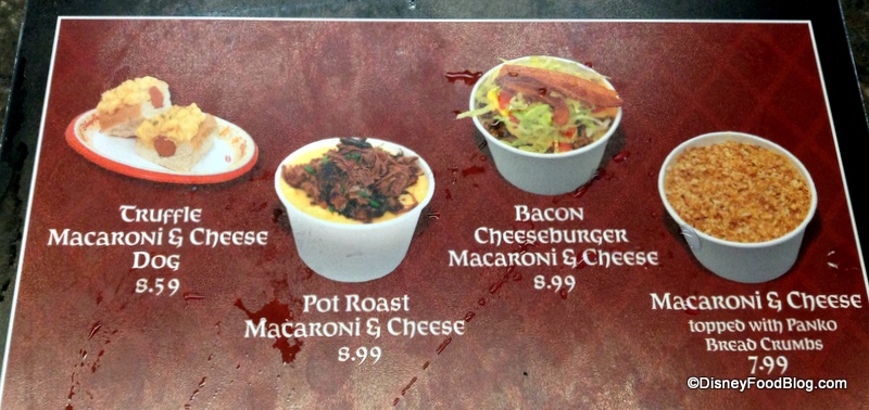 Previously home to Pinocchio’s Punch and Jiminy Cricket’s Slush, the menu currently features Lemonade Slush, “a favorite of Pinocchio’s,” and Blue Raspberry Slush, “a favorite of the Blue Fairy.” (By the way, it’s not designated on the menu, but these slushes are good for a snack credit on the Disney Dining Plan.)