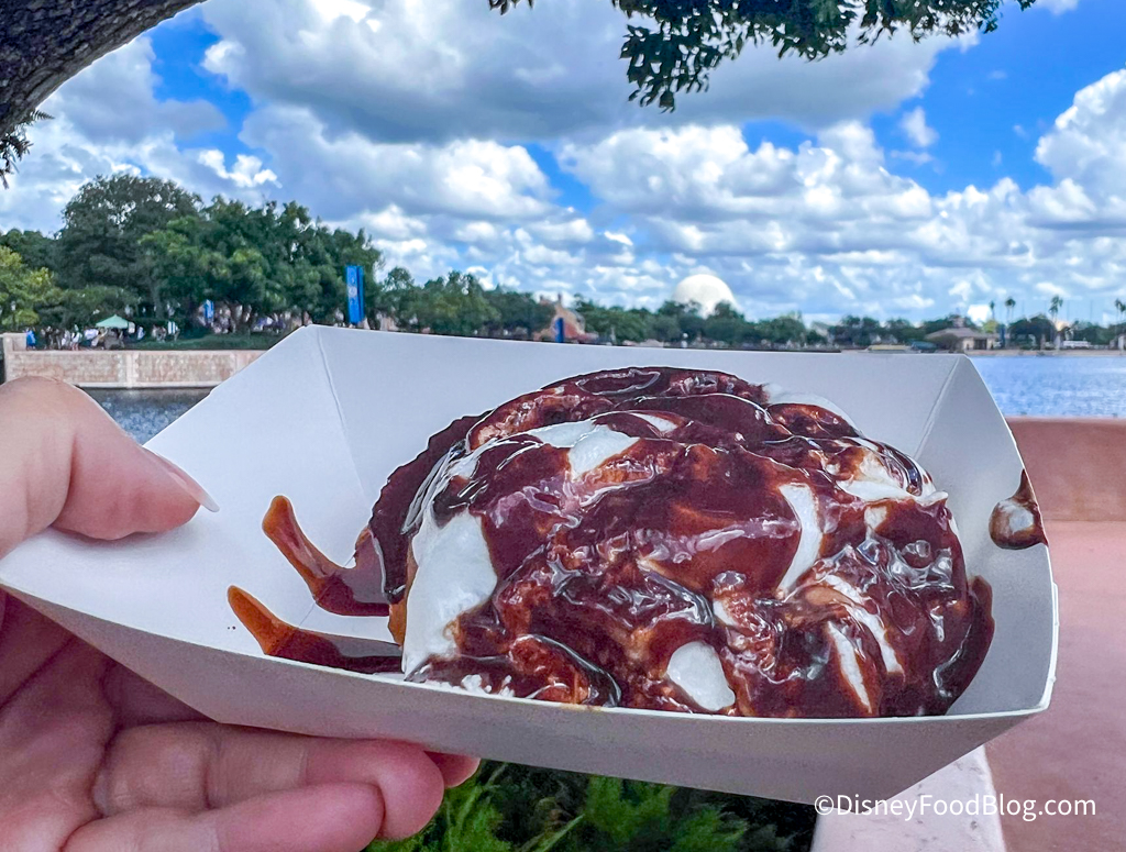 - Belgian Waffle with warm chocolate ganache — $5.50, Disney Dining Plan snack credit eligible