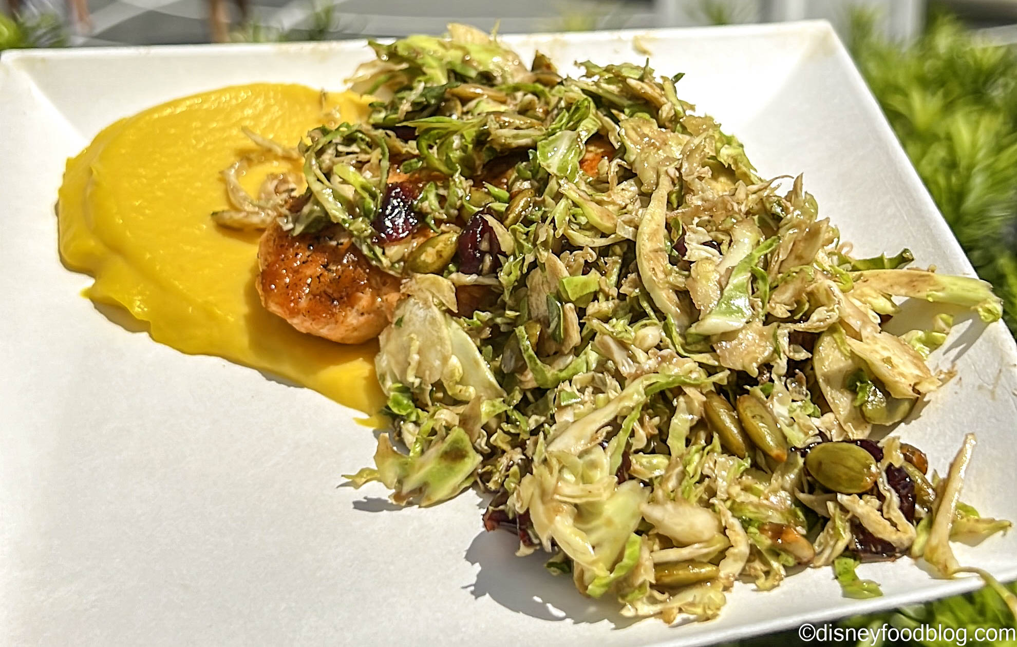 - Cast Iron-seared River Trout with vanilla-butternut squash purée, brussels sprouts salad, candied pecans, spiced pumpkin seeds, dried cranberries, and maple dressing (New) — $7.25, DDP Snack Eligible