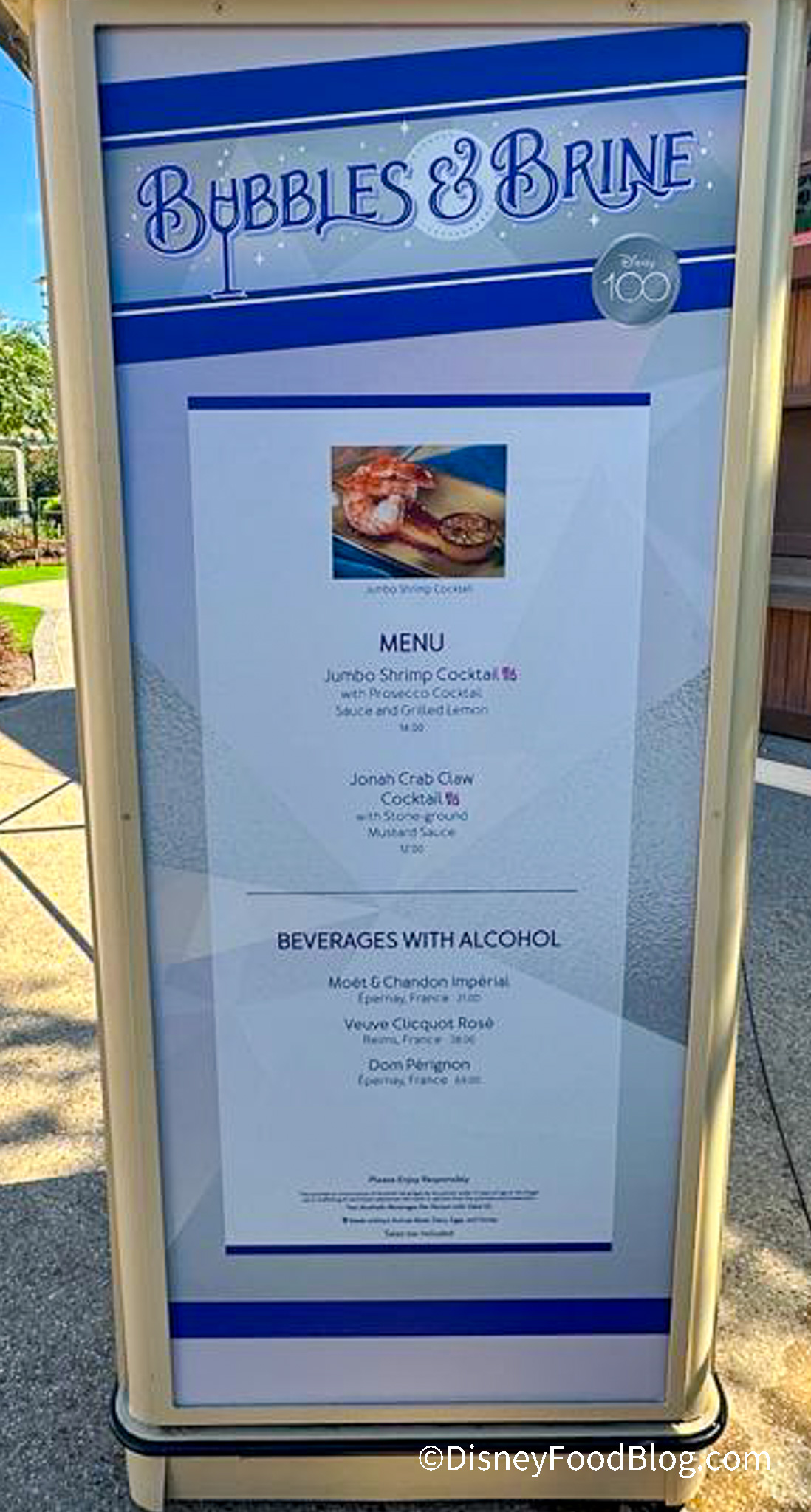 Bubbles & Brine is a NEW booth at the EPCOT Food and Wine Festival this year! It’s one of four new booths that has been added to commemorate the Disney 100th Anniversary Celebration.