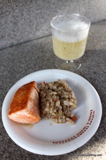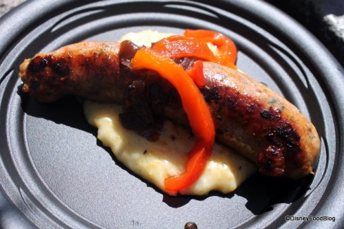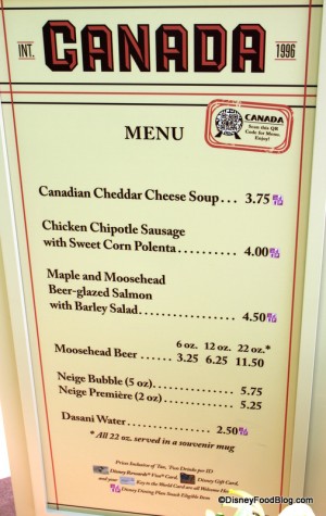 Welcome to Canada and enjoy one of my fave pavilions! On the menu is the famed cheddar cheese soup and maple-glazed salmon. I highly recommend one of my favorite items from Le Cellier Steakhouse – the sausage with sweet corn polenta. It was one of the best items at the festival last year!