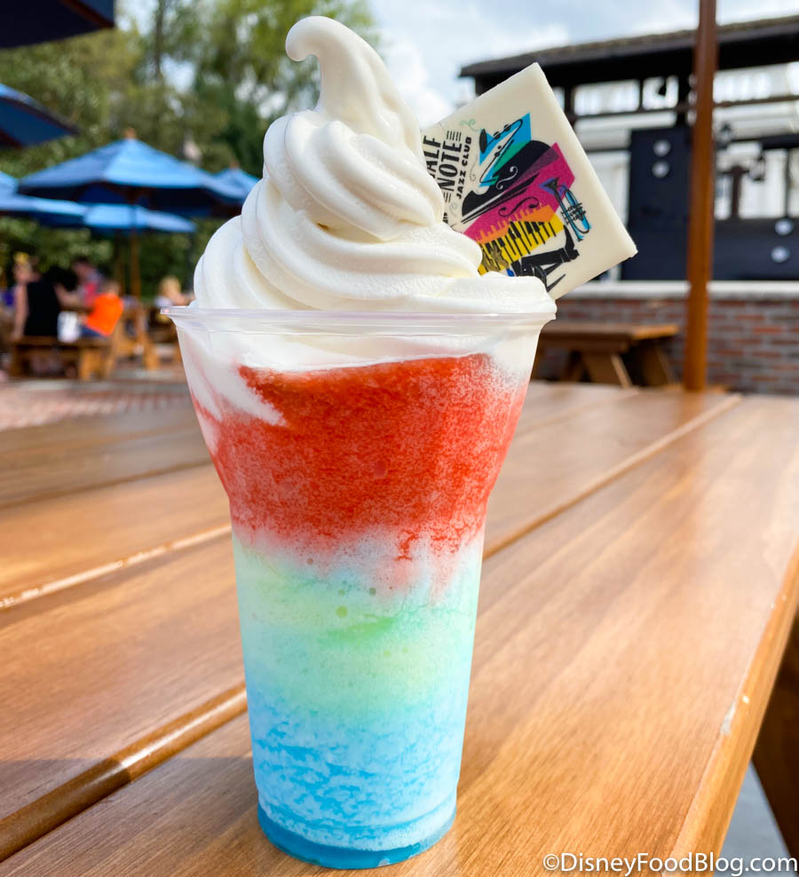 The Half Note Float is back in The American Adventure Pavilion! Here, we’ve got layered strawberry Fanta, lemonade, blue raspberry Fanta slushy, and vanilla ice cream. The whole thing is topped with white chocolate artwork from Disney’s movie Soul.