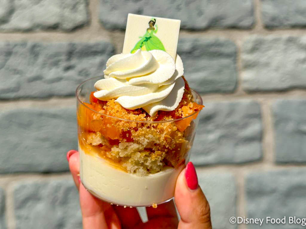 You can pick up some Peach Cobbler for the celebration! This version presents cinnamon panna cotta, peach cobbler, brown sugar streusel, and whipped cream with a Tiana chocolate piece for decoration.