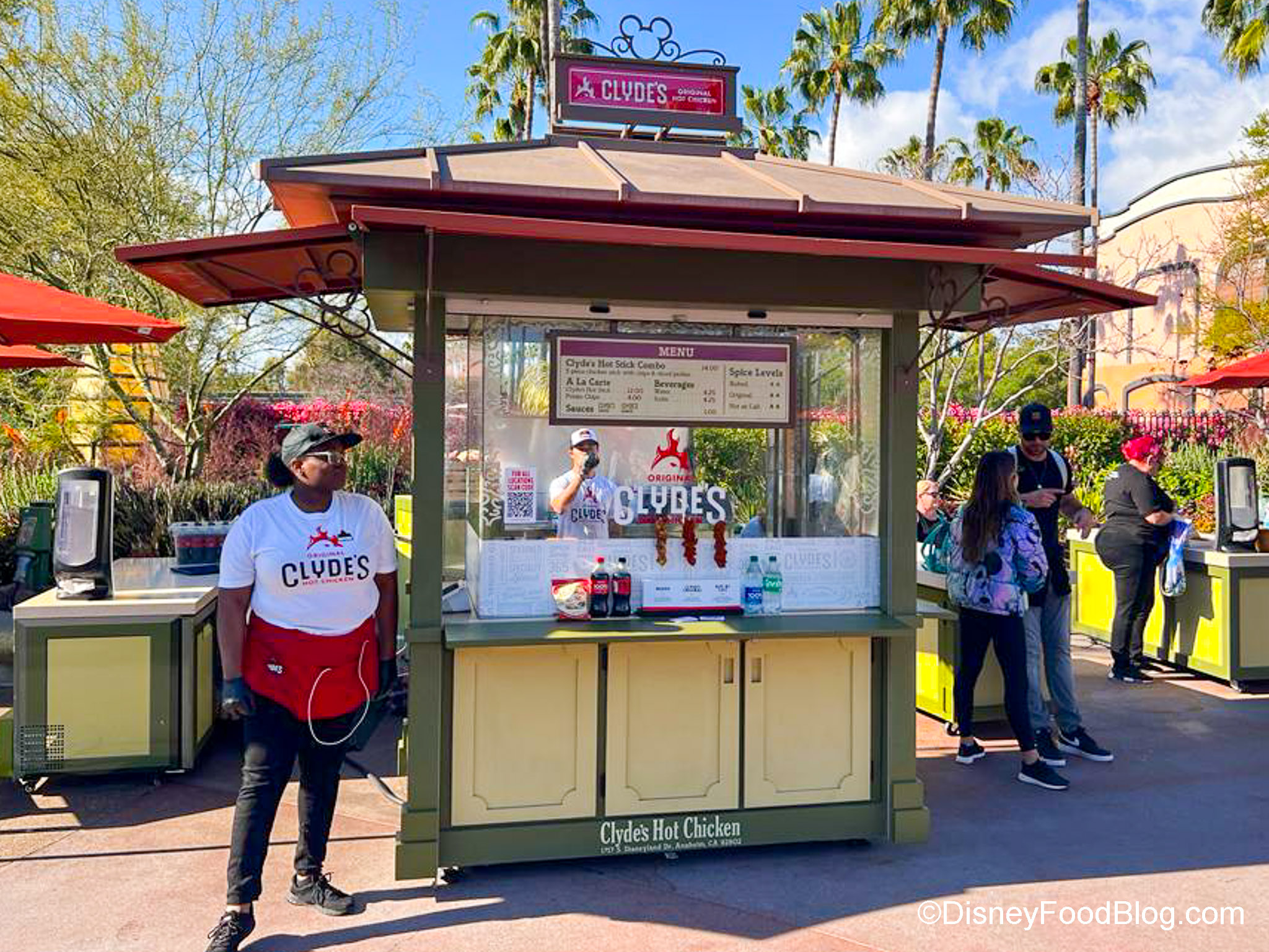 For those not familiar with Clyde’s, the restaurant serves up “traditional hot chicken” and also has locations in Fullerton, Montclair, Santa Ana, Placentia, and Las Vegas. In Downtown Disney, you’ll find its signature item — “Clyde’s Hot Sticks” — at a cart. Sticks are served in three different heat levels: Naked, Original, and Hot as Cali!