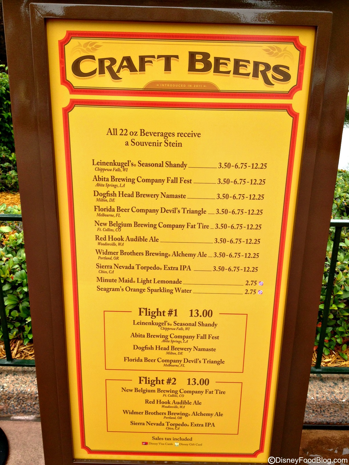 - Beer Flight 1: Dogfish Head Brewery Namaste, Abita Brewing Company Fall Fest, Leinenkugel’s® Seasonal Shandy, Florida Beer Company Devil’s Triangle – $13.00