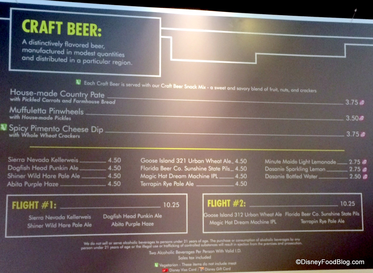 - Beer Flight 2: Goose Island, 312 Urban Wheat Ale; Florida Beer Company, Sunshine State Pils; Magic Hat Brewery, Dream Machine IPL; and Terrapin Beer Company, Rye Pale Ale – $10.25