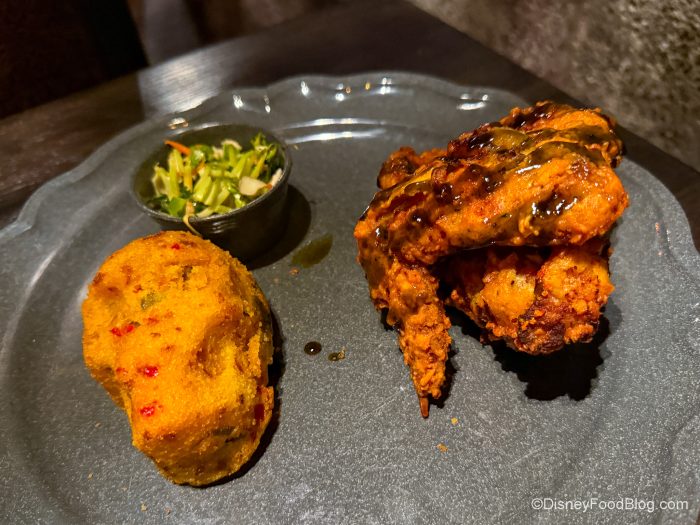 - Darkmoor Black Wings — Darkmoor spicy chili dusted fried wings, with a smoked cheddar, charred scallions, pimento cornbread skull, soy chili garlic sauce, served with a familiar slaw