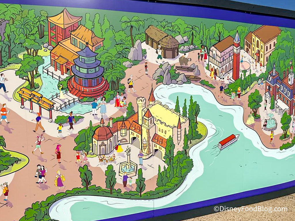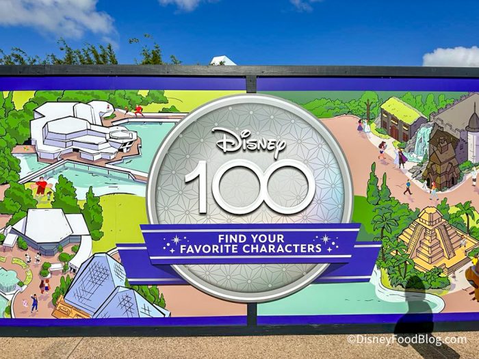 A new Disney100 mural was posted in World Celebration located along the walkway to World Showcase featuring 100 (!!!) of your favorite Disney characters in EPCOT’s various neighborhoods.